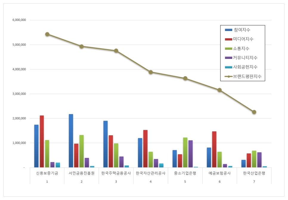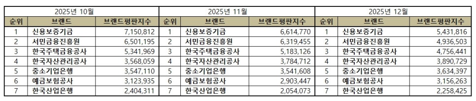 2025년 12월 금융위원회 공공기관 브랜드평판 순위는 신용보증기금, 서민금융진흥원, 한국주택금융공사, 한국자산관리공사, 중소기업은행, 예금보험공사, 한국산업은행 순이었다.