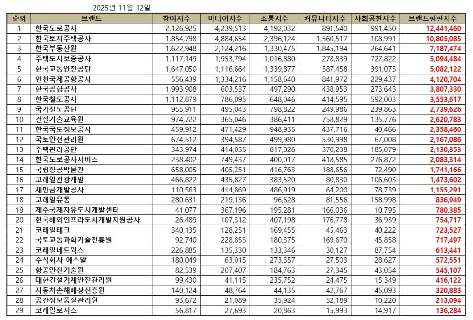 [브랜드평판] 국토교통부 공공기관 브랜드 2025년 11월 빅데이터 분석결과...1위 한국도로공사, 2위 한국토지주택공사, 3…
