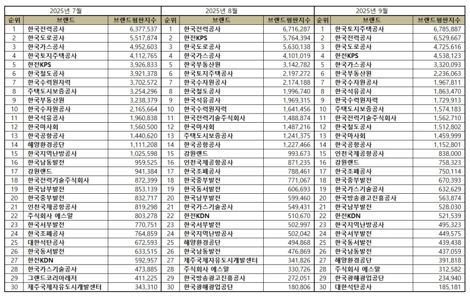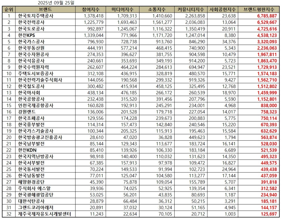 2025년 9월 공기업 브랜드평판 순위는 한국토지주택공사, 한국전력공사, 한국도로공사, 한전KPS, 한국가스공사, 한국부동산원, 한국수자원공사, 한국석유공사, 한국수력원자력, 주택도시보증공사, 한국전력기술주식회사, 한국철도공사, 한국마사회, 한국공항공사, 인천국제공항공사, 강원랜드, 한국조폐공사, 한국중부발전, 한국가스기술공사, 한국방송광고진흥공사, 한국남부발전, 한전KDN, 한국지역난방공사, 한국서부발전, 한국동서발전, 한국남동발전, 해양환경공단, 주식회사 에스알, 한국광해광업공단, 대한석탄공사, 그랜드코리아레저, 제주국제자유도시개발센터 순으로 분석되었다.