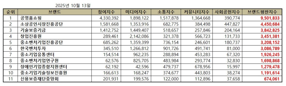 [브랜드평판] 중소벤처기업부 공공기관 브랜드 2025년 10월 빅데이터 분석결과...1위 공영홈쇼핑, 2위 소상공인시장진흥공단…