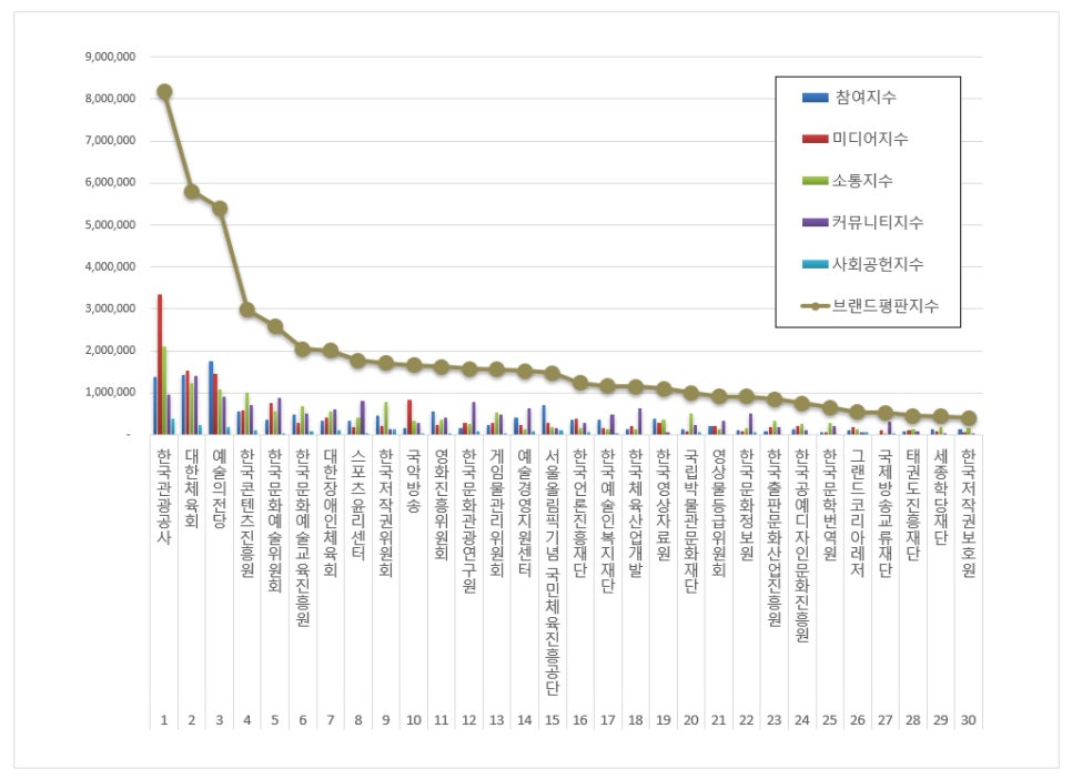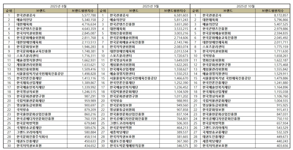 문화체육관광부 공공기관 브랜드평판 2025년 10월 빅데이터 분석결과, 1위 한국관광공사 2위 대한체육회 3위 예술의전당 순으로 분석되었다.