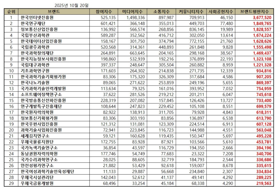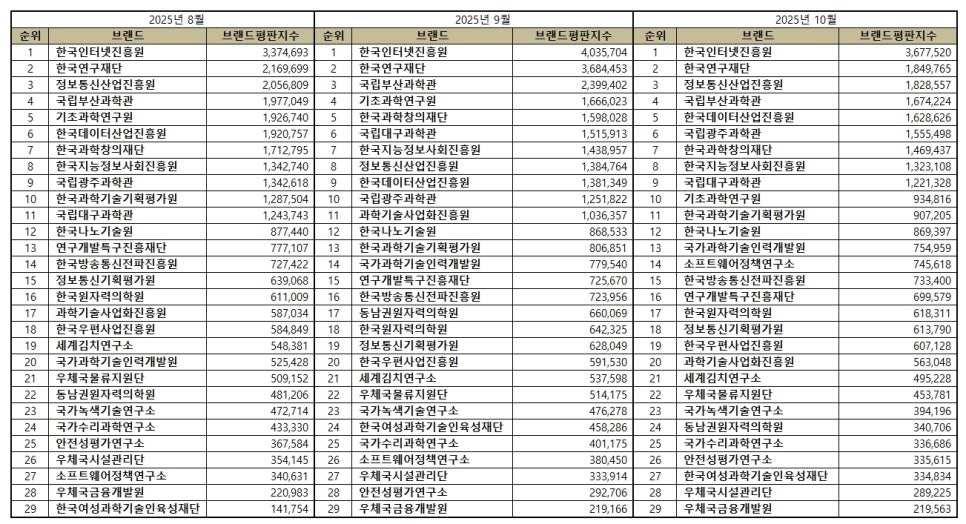 [브랜드평판] 과학기술정보통신부 공공기관 브랜드 2025년 10월 빅데이터 분석결과...1위 한국인터넷진흥원, 2위 한국연구재…