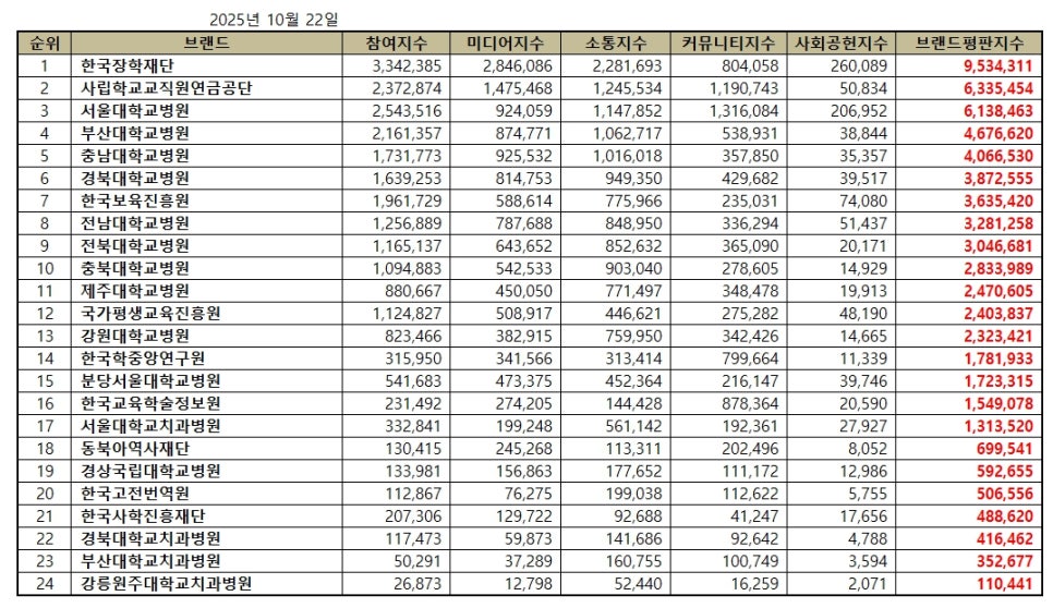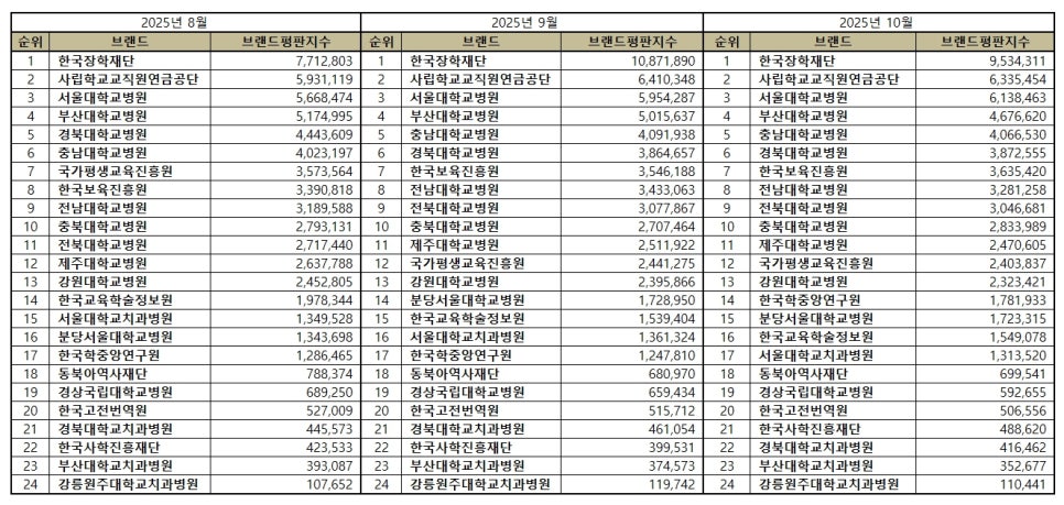 교육부 공공기관 브랜드평판 2025년 10월 빅데이터 분석결과, 1위 한국장학재단 2위 사립학교교직원연금공단 3위 서울대학교병원 순으로 분석되었다.