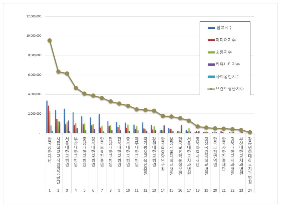 4위, 부산대학교병원 브랜드는 참여지수 2,161,357 미디어지수 874,771 소통지수 1,062,716 커뮤니티지수 538,931 사회공헌지수 38,844가 되면서 브랜드평판지수 4,676,620으로 분석됐다. 지난 9월 브랜드평판지수 5,015,637과 비교해보면 6.76% 하락했다.