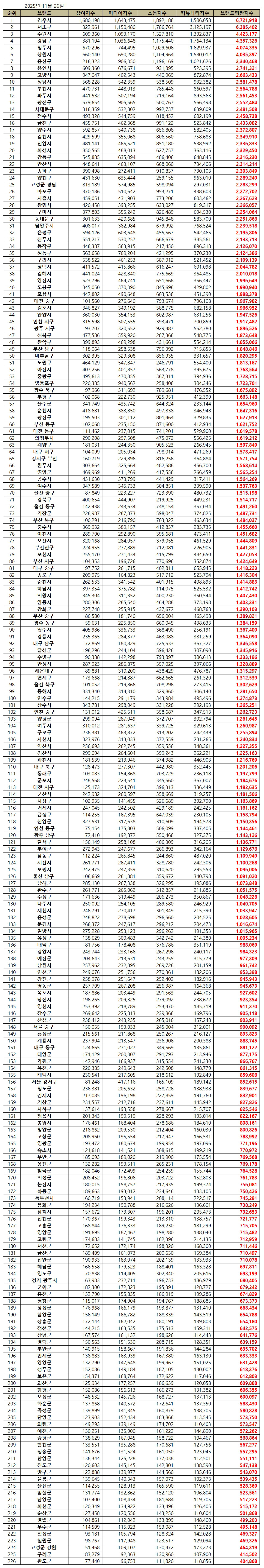 한국기업평판연구소는 대한민국 기초자치단체 226개 브랜드에 대해 브랜드 평판조사를 하였다. 대한민국 기초자치단체 브랜드에 대한 지난 한달간 빅데이터 평판을 분석하였는데 2025년 10월 26일부터 2025년 11월 26일까지의 226개 기초자치단체 브랜드 빅데이터 307,796,039개를 분석하여 소비자와 브랜드와의 관계 분석을 하였다. 지난 10월 기초자치단체 브랜드 빅데이터 342,840,565개와 비교하면 10.22% 줄어들었다.