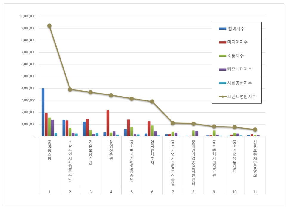 5위, 중소벤처기업진흥공단 브랜드는 참여지수 613,472 미디어지수 1,398,799 소통지수 762,611 커뮤니티지수 212,559 사회공헌지수 160,038이 되면서 브랜드평판지수 3,147,478로 분석됐다. 지난 11월 브랜드평판지수 3,226,867과 비교해보면 2.46% 하락했다.