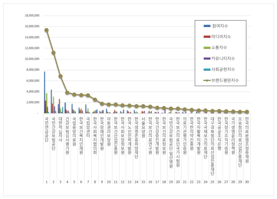 2위, 국민건강보험공단 브랜드는 참여지수 4,417,781 미디어지수 1,815,373 소통지수 3,117,851 커뮤니티지수 1,329,741 사회공헌지수 493,539가 되면서 브랜드평판지수 11,174,285로 분석됐다. 지난 11월 브랜드평판지수 14,263,356과 비교해보면 21.66% 하락했다.