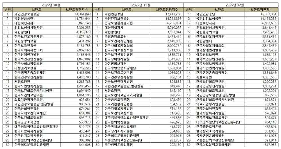 [브랜드평판] 보건복지부 공공기관 브랜드 2025년 12월 빅데이터 분석결과...1위 국민연금공단, 2위 국민건강보험공단, 3…
