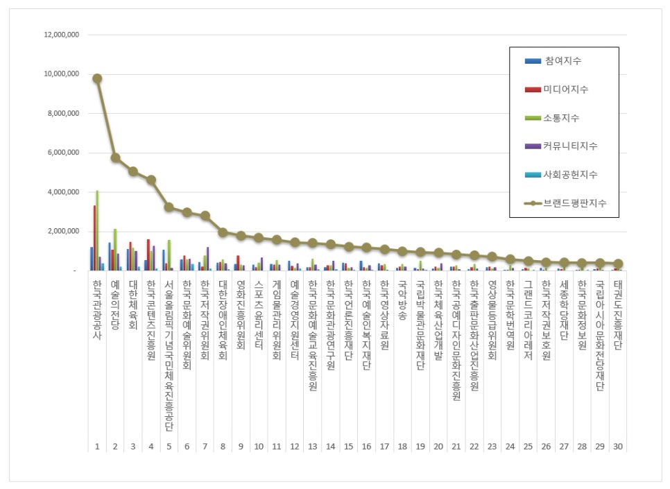 문화체육관광부 공공기관 브랜드평판 분석은 참여지수, 미디어지수, 소통지수, 커뮤니티지수, 사회공헌지수로 구분하여 브랜드평판지수를 산출하였다.
