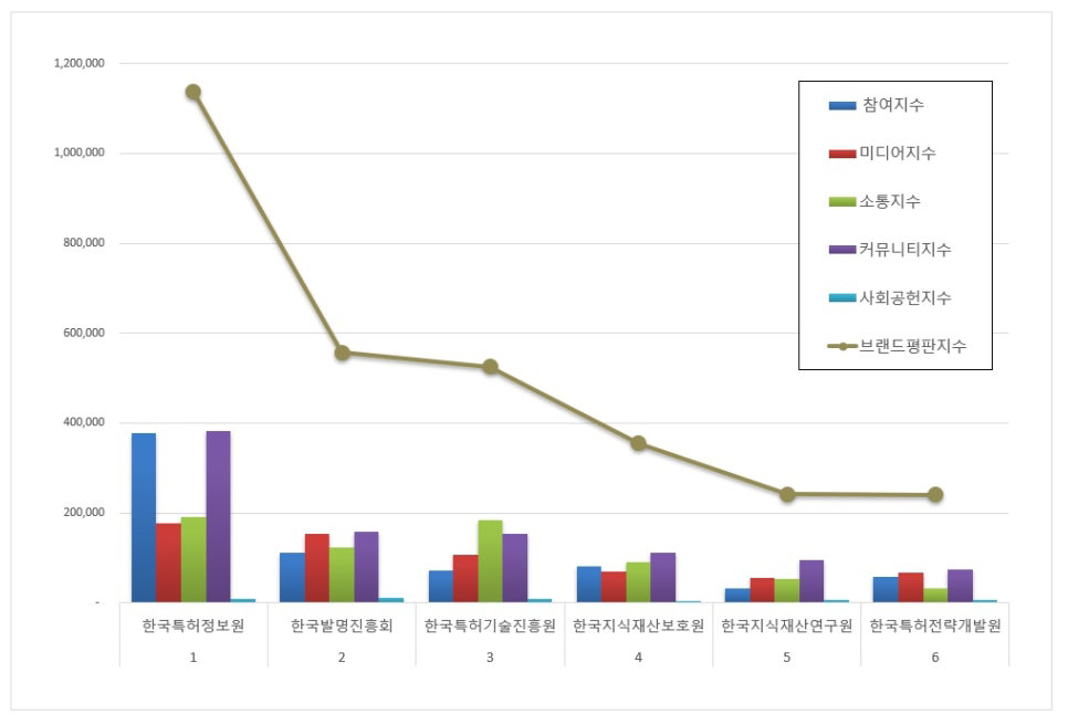 1위, 한국특허정보원 브랜드는 참여지수 378,525 미디어지수 175,760 소통지수 189,862 커뮤니티지수 383,293 사회공헌지수 9,593이 되면서 브랜드평판지수 1,137,033으로 분석됐다. 지난 12월 브랜드평판지수 1,117,147과 비교해보면 1.78% 상승했다.