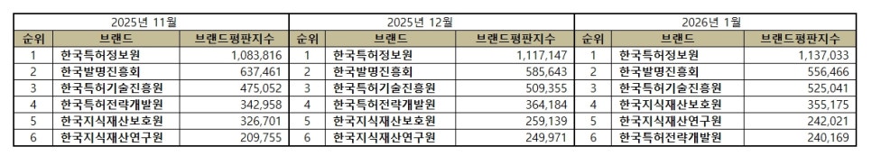 특허청 공공기관 브랜드평판 2026년 1월 빅데이터 분석결과, 1위 한국특허정보원 2위 한국발명진흥회 3위 한국특허기술진흥원 순으로 분석되었다.