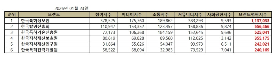 한국기업평판연구소 ( 소장 구창환 ) 는 국내 브랜드의 평판지수를 매달 측정하여 브랜드 평판지수의 변화량을 발표하고 있다. 2026년 1월 특허청 공공기관 브랜드평판지수는 2025년 12월 23일부터 2026년 1월 23일까지의 6개 특허청 공공기관 브랜드에 대한 빅데이터 분석 결과이다.