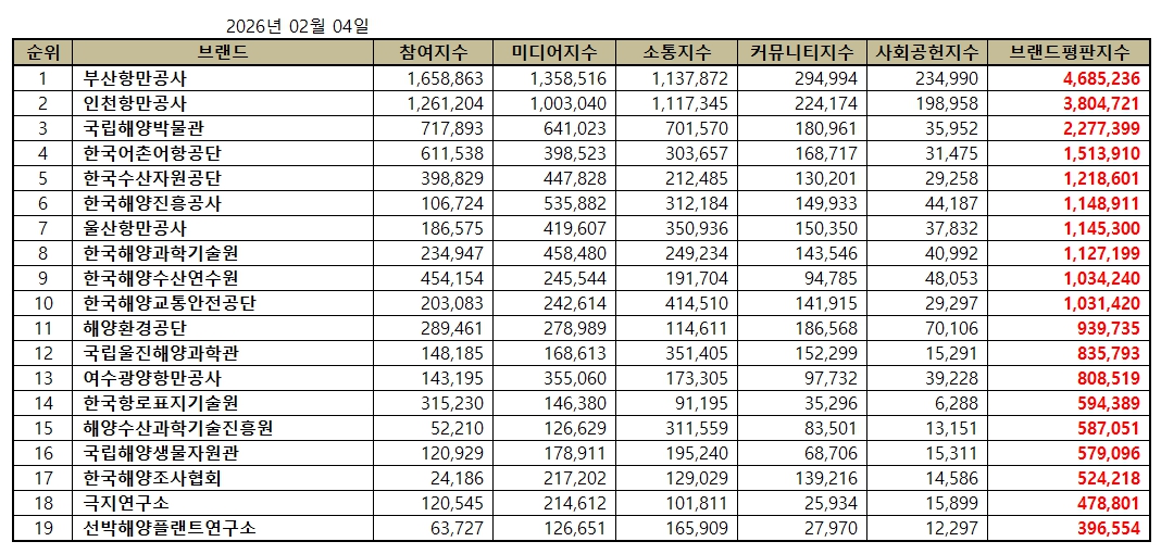 [브랜드평판] 해양수산부 공공기관 브랜드 2026년 2월 빅데이터 분석결과...1위 부산항만공사, 2위 인천항만공사, 3위 국…