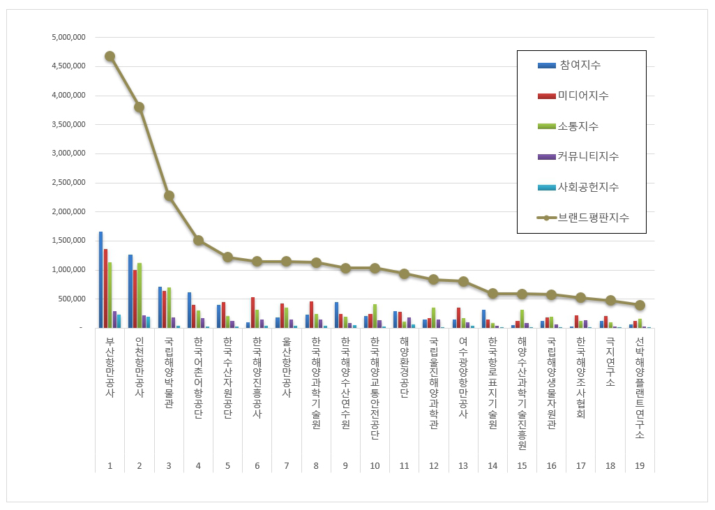 해양수산부 공공기관 브랜드평판 분석은 참여지수, 미디어지수, 소통지수, 커뮤니티지수, 사회공헌지수로 구분하여 브랜드평판지수를 산출하였다.