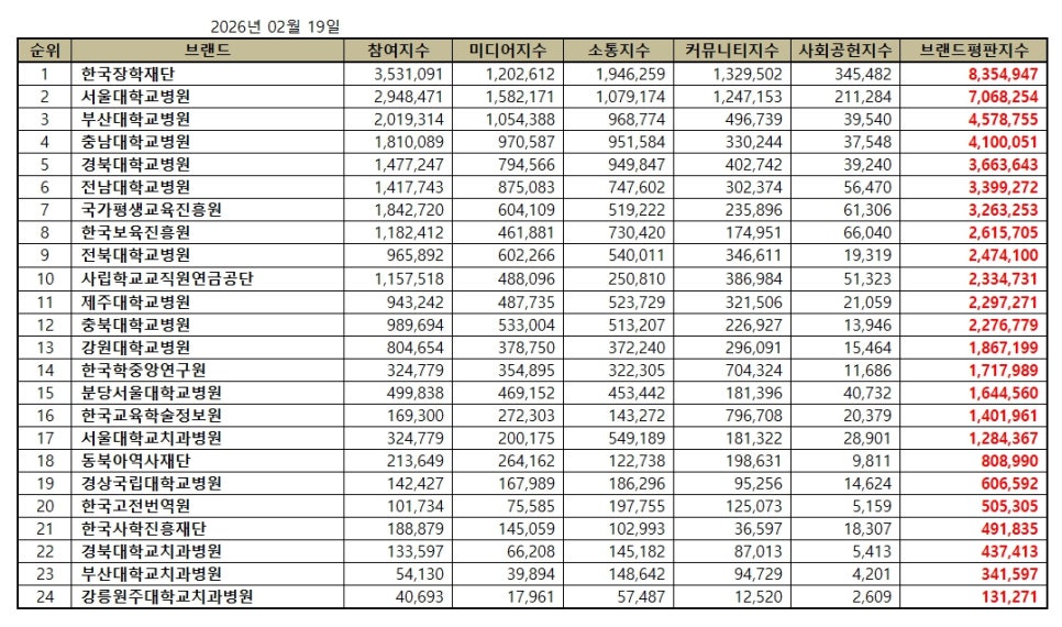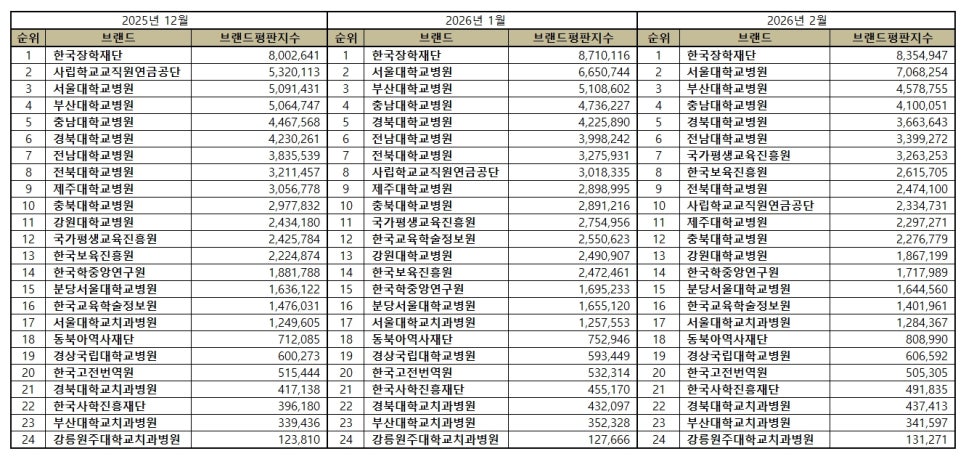 [브랜드평판] 교육부 공공기관 브랜드 2026년 2월 빅데이터 분석결과...1위 한국장학재단, 2위 서울대학교병원, 3위 부산…