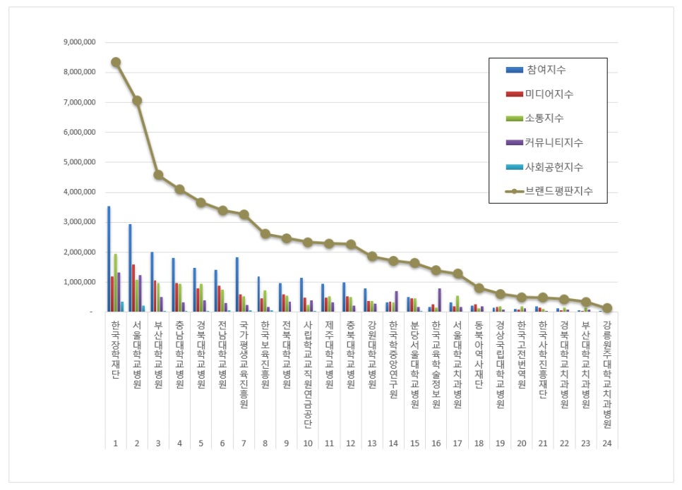 2위, 서울대학교병원 브랜드는 참여지수 2,948,471 미디어지수 1,582,171 소통지수 1,079,174 커뮤니티지수 1,247,153 사회공헌지수 211,284가 되면서 브랜드평판지수 7,068,254로 분석됐다. 지난 1월 브랜드평판지수 6,650,744와 비교해보면 6.28% 상승했다.