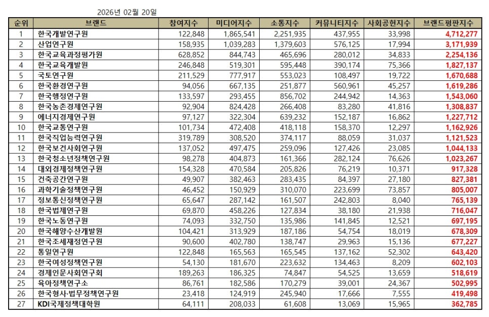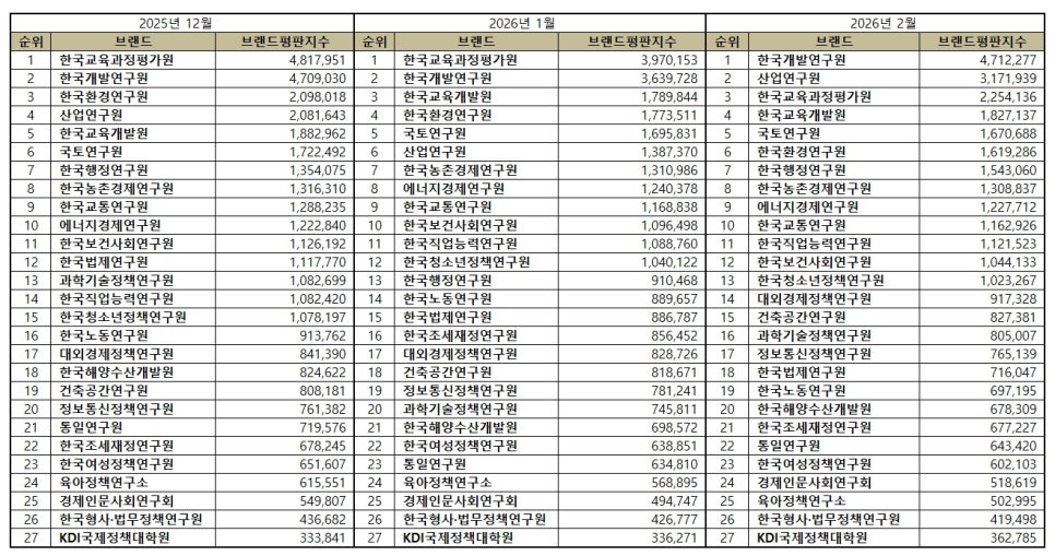 국무조정실 공공기관 브랜드평판 2026년 2월 빅데이터 분석결과, 1위 한국개발연구원 2위 산업연구원 3위 한국교육과정평가원 순으로 분석되었다.