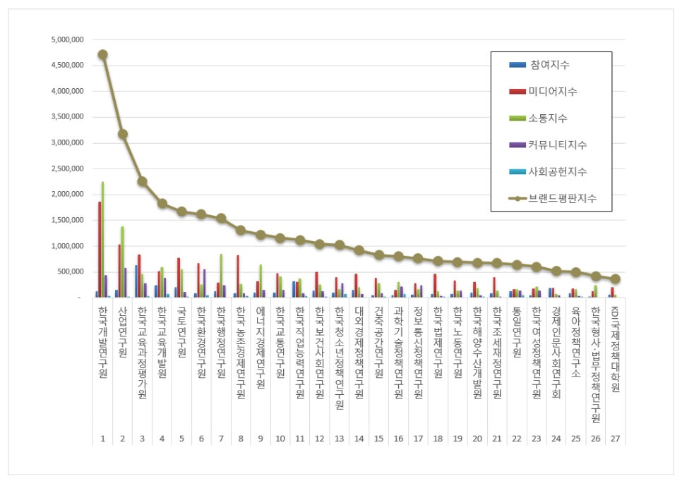 1위, 한국개발연구원 브랜드는 참여지수 122,848 미디어지수 1,865,541 소통지수 2,251,935 커뮤니티지수 437,955 사회공헌지수 33,998이 되면서 브랜드평판지수 4,712,277로 분석됐다. 지난 1월 브랜드평판지수 3,639,728과 비교해보면 29.47% 상승했다.