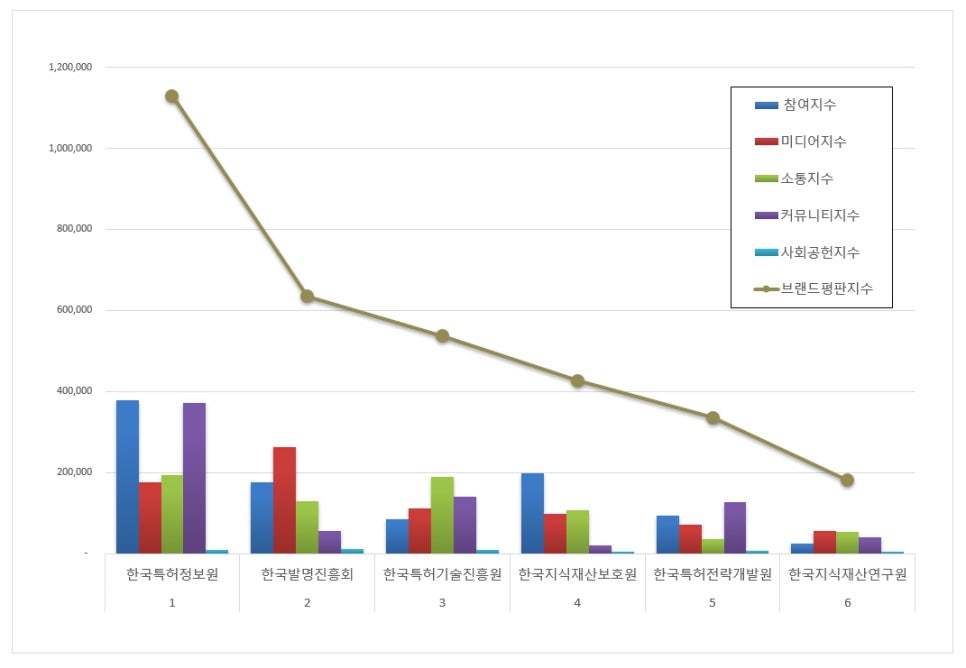 1위, 한국특허정보원 브랜드는 참여지수 378,525 미디어지수 176,259 소통지수 193,855 커뮤니티지수 371,073 사회공헌지수 9,674가 되면서 브랜드평판지수 1,129,387로 분석됐다. 지난 1월 브랜드평판지수 1,137,033과 비교해보면 0.67% 하락했다.