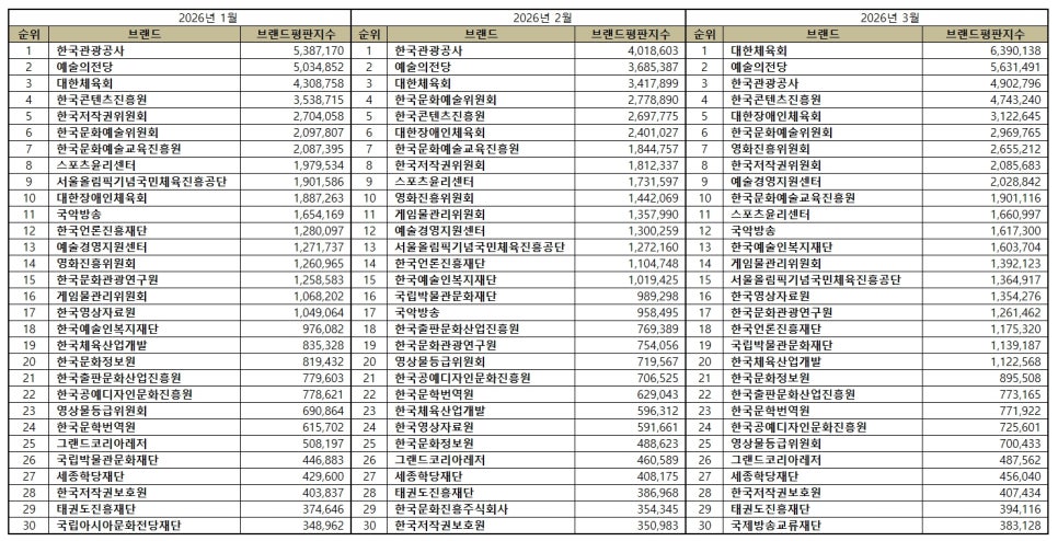 2026년 3월 문화체육관광부 공공기관 브랜드평판 순위는 대한체육회, 예술의전당, 한국관광공사, 한국콘텐츠진흥원, 대한장애인체육회, 한국문화예술위원회, 영화진흥위원회, 한국저작권위원회, 예술경영지원센터, 한국문화예술교육진흥원, 스포츠윤리센터, 국악방송, 한국예술인복지재단, 게임물관리위원회, 서울올림픽기념국민체육진흥공단, 한국영상자료원, 한국문화관광연구원, 한국언론진흥재단, 국립박물관문화재단, 한국체육산업개발, 한국문화정보원, 한국출판문화산업진흥원, 한국문학번역원, 한국공예디자인문화진흥원, 영상물등급위원회, 그랜드코리아레저, 세종학당재단, 한국저작권보호원, 태권도진흥재단, 국제방송교류재단, 한국문화진흥주식회사, 국립아시아문화전당재단, 한국도박문제예방치유원 순이었다.