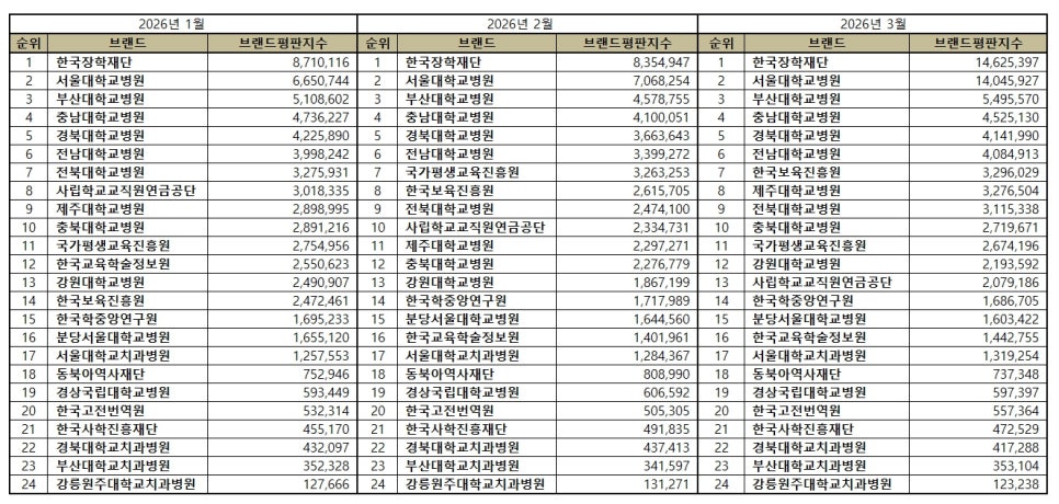 [브랜드평판] 교육부 공공기관 브랜드 2026년 3월 빅데이터 분석결과...1위 한국장학재단, 2위 서울대학교병원, 3위 부산…