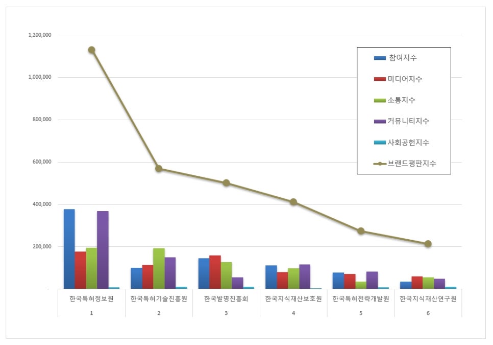 1위, 한국특허정보원 브랜드는 참여지수 378,525 미디어지수 176,879 소통지수 196,220 커뮤니티지수 369,780 사회공헌지수 9,775가 되면서 브랜드평판지수 1,131,180으로 분석됐다. 지난 2월 브랜드평판지수 1,129,387과 비교해보면 0.16% 상승했다.