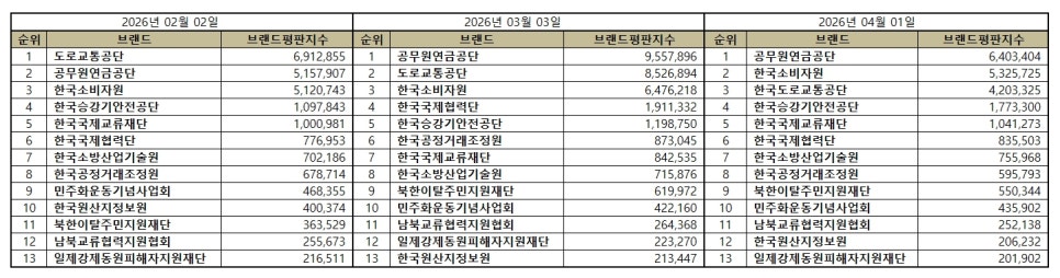 행정안전 공공기관 브랜드평판 2026년 4월 빅데이터 분석결과, 1위 공무원연금공단 2위 한국소비자원 3위 한국도로교통공단 순으로 분석되었다.