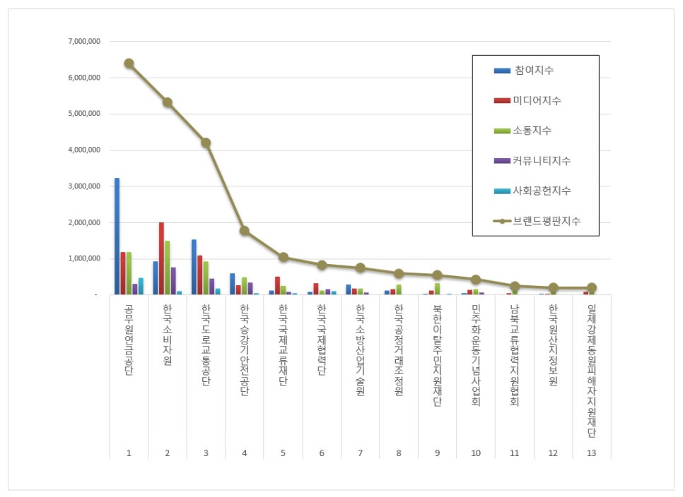 2위, 한국소비자원 브랜드는 참여지수 923,035 미디어지수 2,013,951 소통지수 1,500,902 커뮤니티지수 774,004 사회공헌지수 113,832가 되면서 브랜드평판지수 5,325,725로 분석됐다. 지난 3월 브랜드평판지수 6,476,218과 비교해보면 17.76% 하락했다.