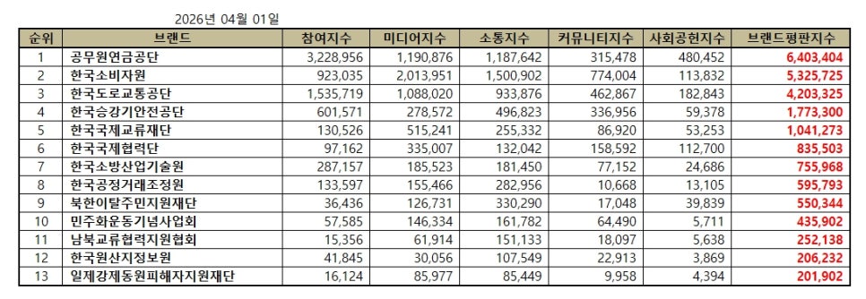 [브랜드평판] 행정안전 공공기관 브랜드 2026년 4월 빅데이터 분석결과...1위 공무원연금공단, 2위 한국소비자원, 3위 한…